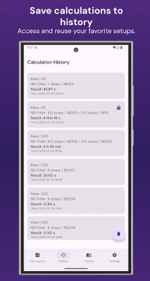 ND Calculator, güçlü ve kullanımı kolay özellikleriyle çekim deneyiminizi baştan sona dönüştürür. Temel enstantane hızınızı ayarlayın, 0 ila 24 durağa kadar (kesirli duraklar dahil) beş adede kadar filtreyi üst üste seçin ve anında doğru ayarları görün – tıpkı kameranızın ekranındaki gibi. Geçmiş hesaplamalarınızı kaydetme, düzenleme veya silme esnekliği sunarken, kendi filtrelerinizi "sahip olunan" olarak işaretleyerek iş akışınızı hızlandırabilirsiniz. Ayrıca, entegre uzun pozlama zamanlayıcısı sayesinde bulb modundaki çekimleriniz için geri sayım başlatabilir, dokunsal geri bildirim ve bildirimlerle kontrolü elinizde tutabilirsiniz. İnternet bağlantısına ihtiyaç duymadan tam işlevsellik sunmasıyla, ND Calculator en ücra köşelerde bile güvenilir yardımcınızdır.
